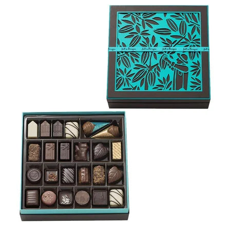 أنواع مشكلة من شوكولا جيف دي بروج الطبيعية 48 قطعة تقدم في بوكس راقي بلونين البني الغامق واكوابلو.