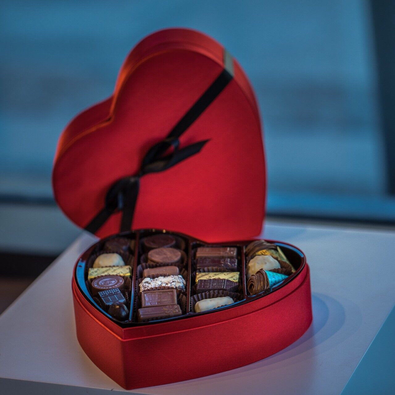 تشكيلة شوكولا طبيعية من جيف دي بروج الفرنسية معبأة في بوكس ساتان على شكل قلب